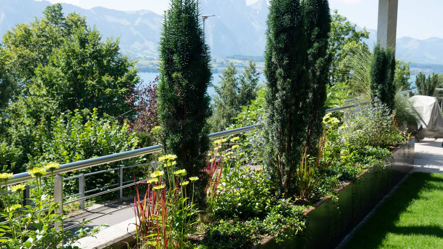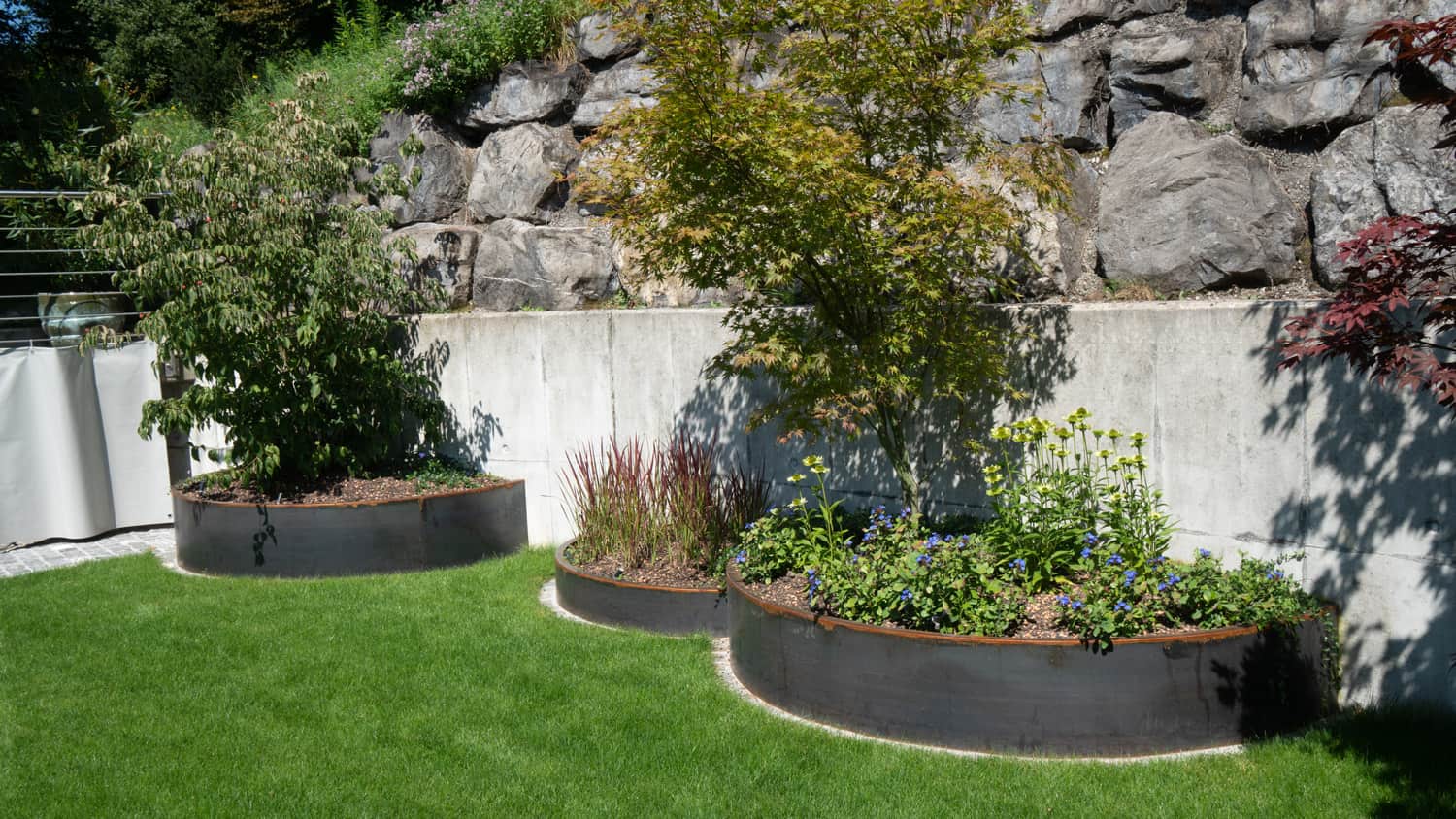 Halbrunde Hochbeetelemente dezent in den Garten integriert. Auf der Seite ein 10m langes, gerades Hochbeet.